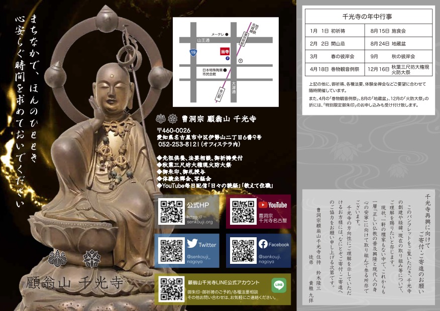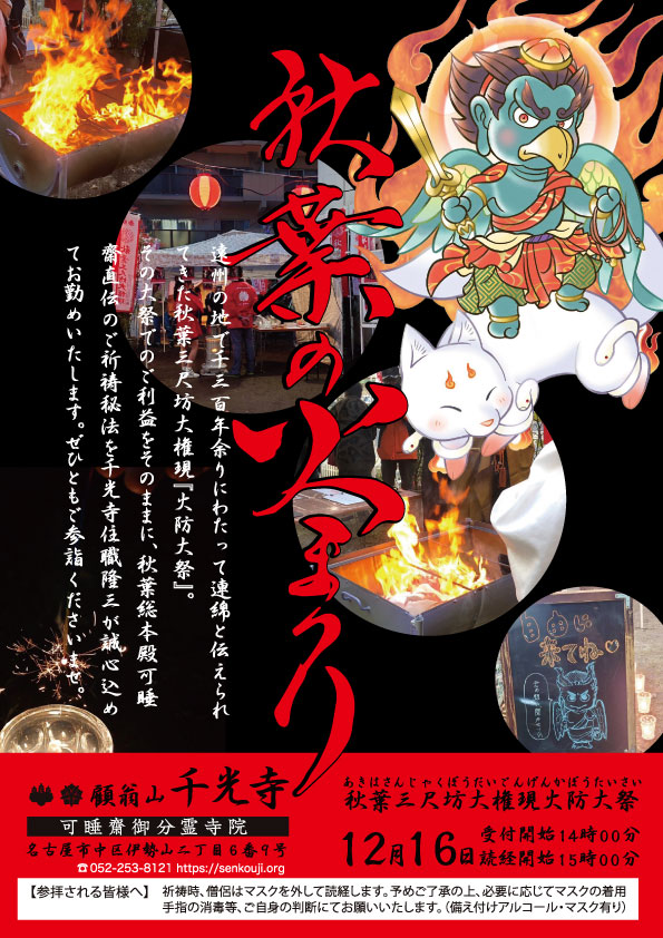 秋葉三尺坊大権現様にお参りして、火防・火の用心のご利益・ご加護を授かります。秋葉総本殿可睡斎にて12月15日に大祭大祈祷を終えた千光寺住職が、その大祭を名古屋で再現する千光寺の火まつり。規模はとても小さいですが、護摩木に願いを込めて焚きあげ、ご祈祷後には千光寺のお札をご用意いたします。無病息災、心願成就、火防・火の用心の願いを込めて、ご都合の良い方はどうぞお参りください。